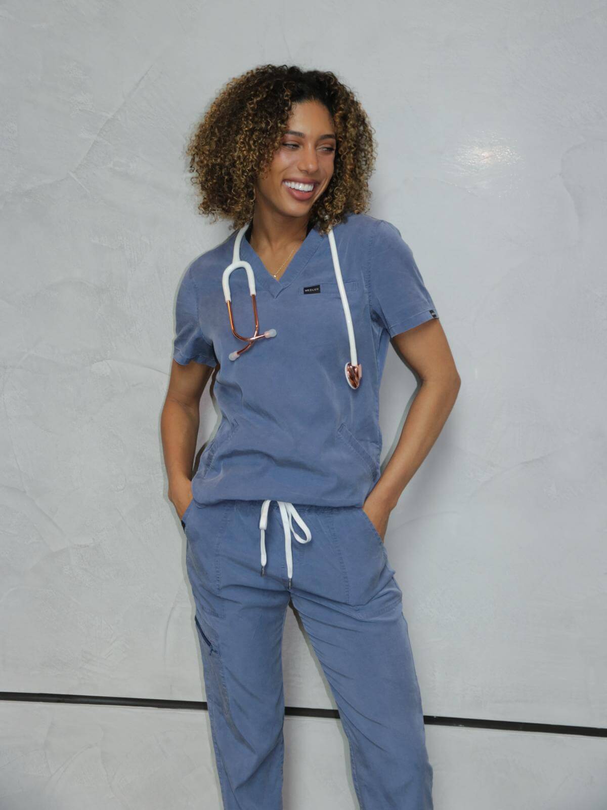 Meet our Slate Blue collection- a cool-toned modern neutral designed for healthcare worked who want comfort and polish. Crafted from our signature buttery- soft lyocell blend, these scrubs feel cool, softer and more breathable than polyester or cotton- especially for long, busy shifts.